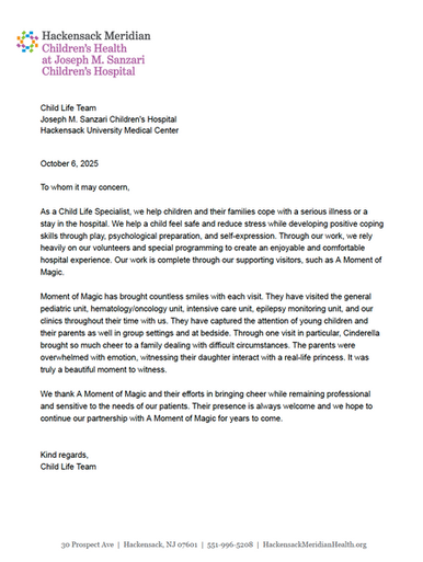 A Moment of Magic RCNJ is dedicated to harnessing the power of play to spark joy, foster connection, reduce isolation, and support the mental health and emotional healing for medically vulnerable children and their families.
